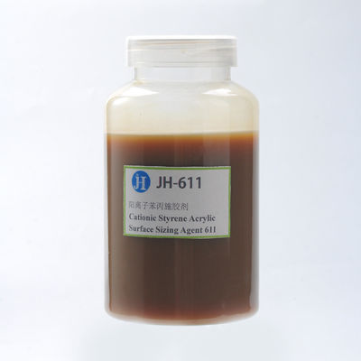 JH-611 é um agente de dimensionamento de superfície catiônico tipo SAE que é composto de estireno, acrilato e colóides protetores especiais.A casca externa é uma casca protetora catiônica, que pode aumentar a ligação entre as fibras do papel e o agente de colagem de superfície para formar um filme contínuo impedindo a penetração de água no papel.Possui baixa permeabilidade e alto efeito de colagem em papel, especialmente papel médio sem colagem interna (resina emulsificada).Também apresenta excelente estabilidade, por exemplo, estabilidade térmica, estabilidade mecânica e estabilidade de armazenamento.O JH-611 funciona tanto em condições de dimensionamento ácidas quanto neutras e é compatível com amido oxidado e amido convertido por enzimas.Além disso, o desempenho de dimensionamento do JH-611 pode ser aprimorado na presença de alumínio.